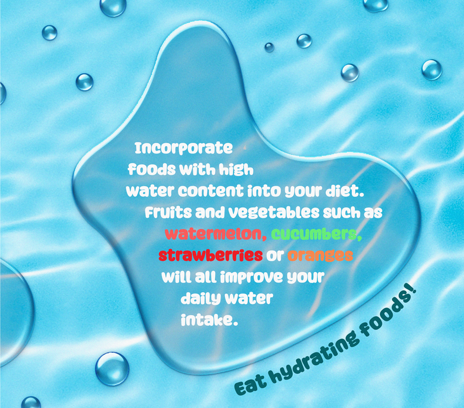 Incorporate foods with high water content into your diet. Fruits and vegetables such as watermeton, cucumbers, strawberries or oranges will all improve your daily water intake.