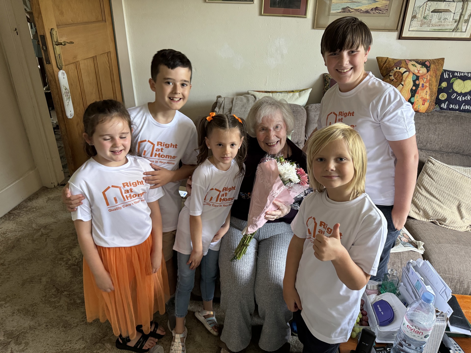 The children wore special Right at Home T-shirts bearing the message ‘going the extra mile to make you smile’ during the tour, which saw them visit 10 Clients.