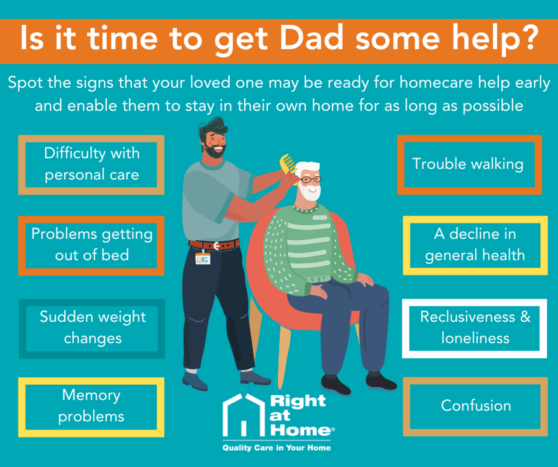 - Find a trusted care company: ask for a CareGiver who is experienced, trained, and compassionate. Schedule a meeting between the CareGiver and your loved one before they start providing care. This will support your loved one in feeling more comfortable with the idea of having a stranger come into their home. At Right at Home - Leeds East, we introduce our CareGivers and Clients at the earliest opportunity to ensure their personalities gel well and the Client is as comfortable as possible.