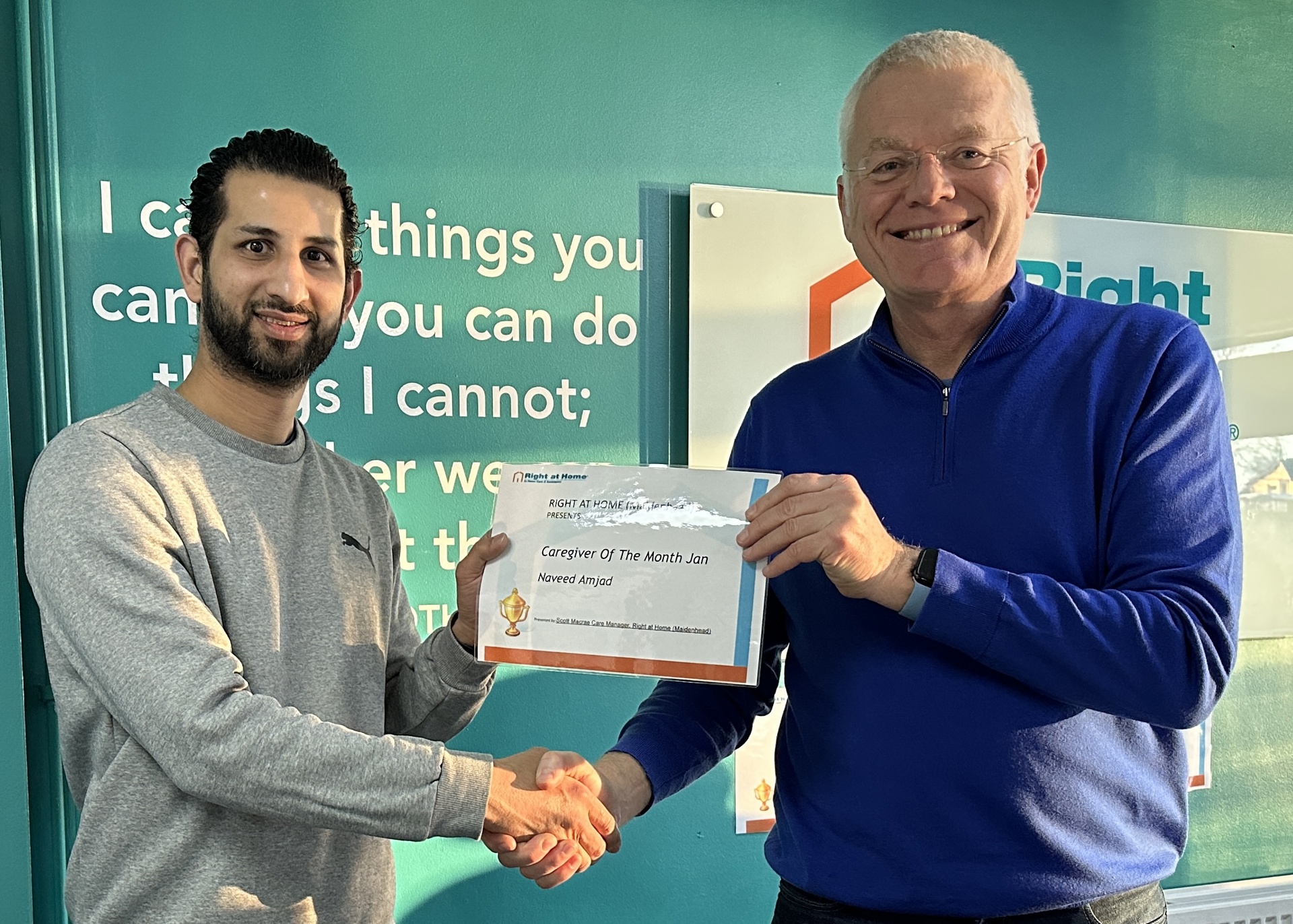 Naveed won our first Employee of the Month award for 2023 for his outstanding care, he receives lots of compliments takes on extra work. He is a real asset to Right at Home Maidenhead.