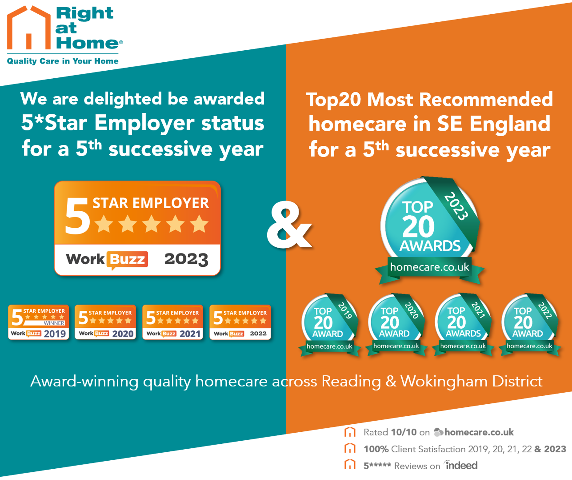 “I am so proud of the team of wonderful people I am privileged to work with for keeping standards high and always being willing to learn how we can be even better as a team, while always having the well-being of our clients at the forefront of their minds. It is very humbling to get such great feedback again this year from the team about how they feel working with Right at Home in the Wokingham and Reading areas – and great that WorkBuzz recognize the great work we all do in the area. The continued excellent feedback from our clients and their families is heart-warming and hugely rewarding for all my team. To be recognised for a 5th year in a row as one of the Top20 providers in the South East of England gives us confidence that our approach of being the best employer we can be really does translate into better care for our amazing clients”.