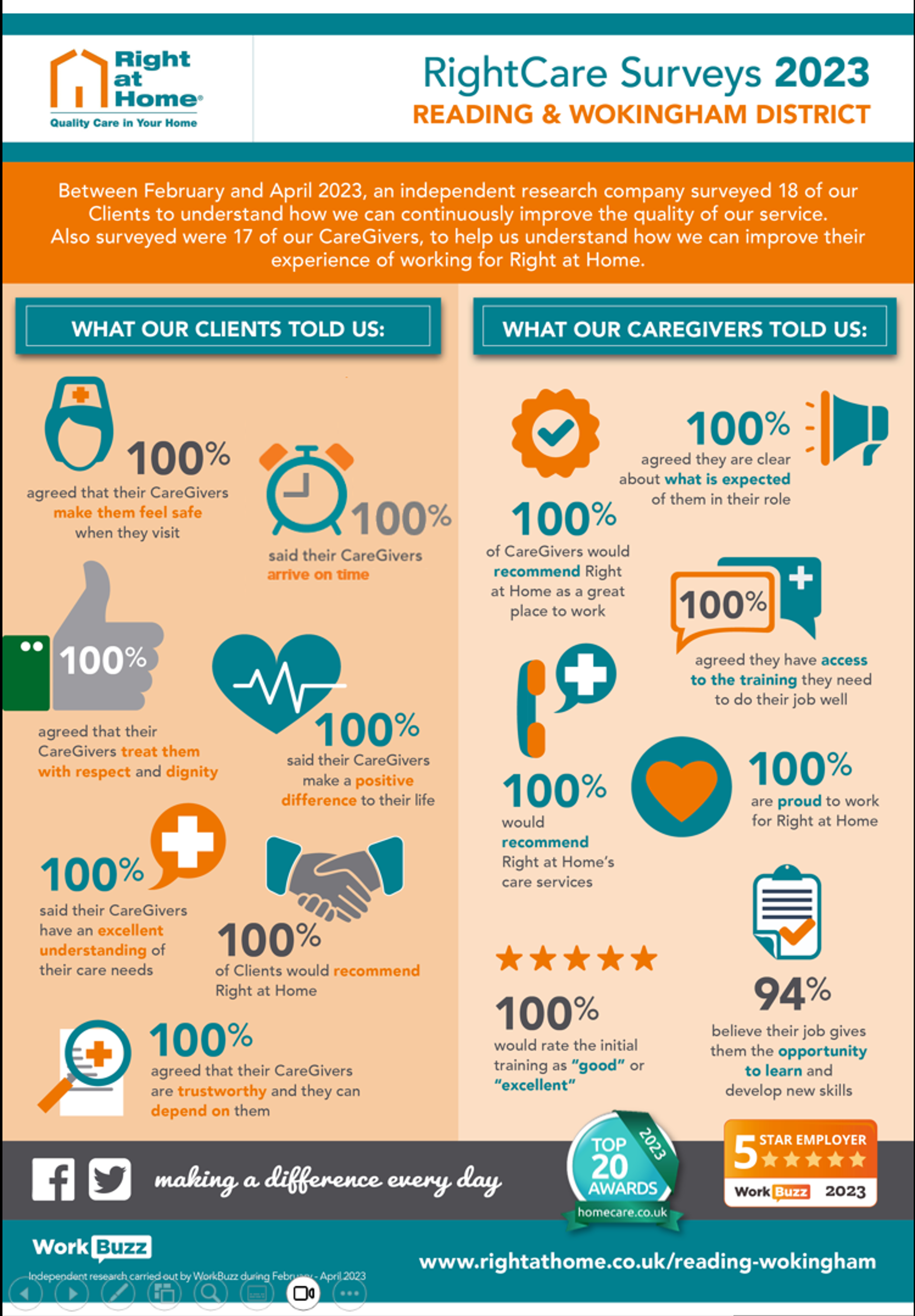 Every employee of Right at Home Reading & Wokingham District took part in the WorkBuzz Satisfaction Survey in 2023, reporting a WorkBuzz “Engagement Scores” of 100%. Anonymised highlights from the report include: